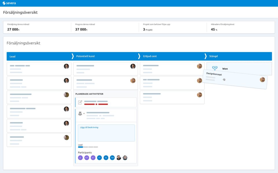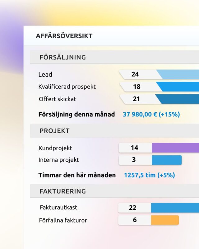 Hantera hela försäljningsflödet, projekt, tidrapportering och fakturering i en programvara. Hanteringen av leads blir smidigare och du kan enkelt schemalägg uppgifter i kalendern.