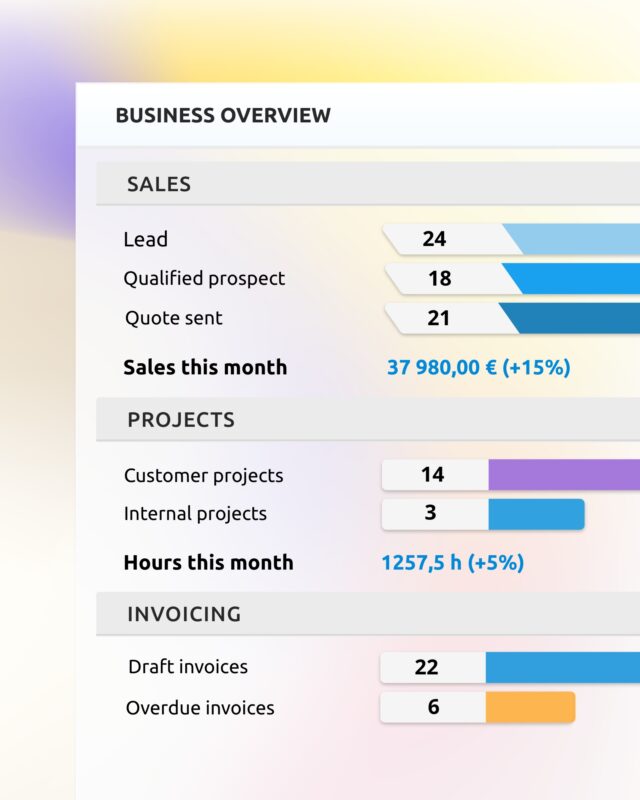 Skapa egna rapporter och nyckeltal för lönsamhet, kundrelationer och projekt. Försäljningsrapporter, resursplaneringsrapporter och faktureringsrapporter hjälper till att styra verksamheten.