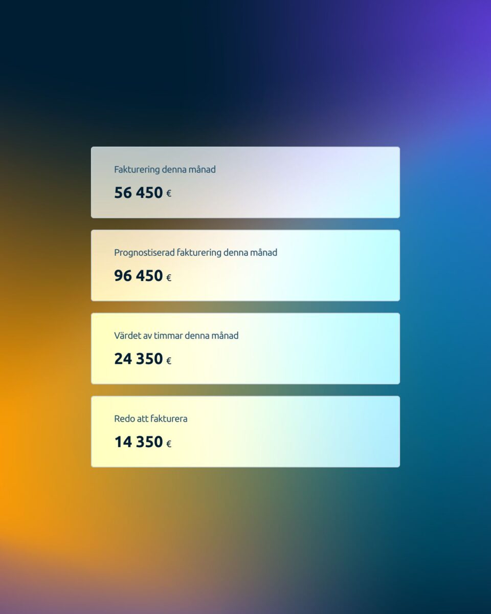 Följ faktureringsprocessen i sammanfattningsvyn. Granska faktureringsprognosen och beloppen för kommande månader. Faktureringsinformation överförs automatiskt till rapporter på projekt-, kund- och företagsnivå.